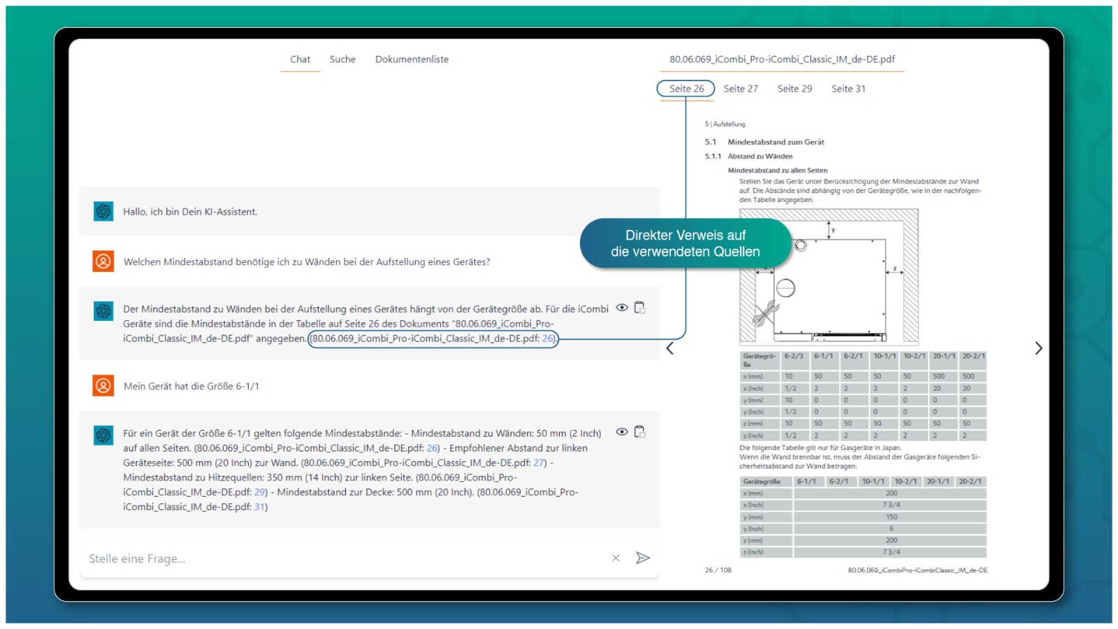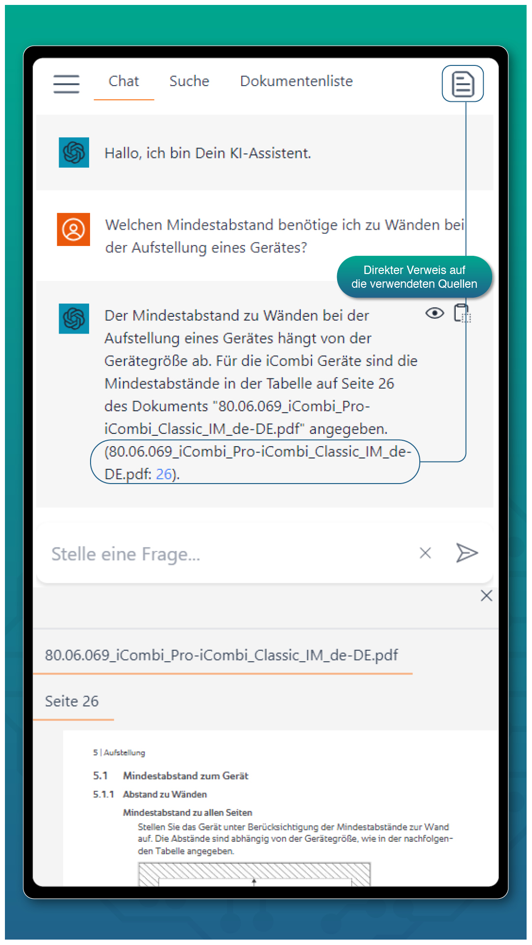Jede Antwort, die von der KI generiert wird, beinhaltet die verschiedenen Quellen der hinterlegten Dokumentationen. Die entsprechenden Bereiche der Dokumentation werden unmittelbar neben der Antwort angezeigt. Durch die Anzeige des Originals entsteht eine Rechtssicherheit, da es nicht hundertprozentig auszuschließen ist, dass die KI eine falsche Antwort generiert. Der Nutzer kann direkt in das Original abspringen und dort weiter recherchieren.